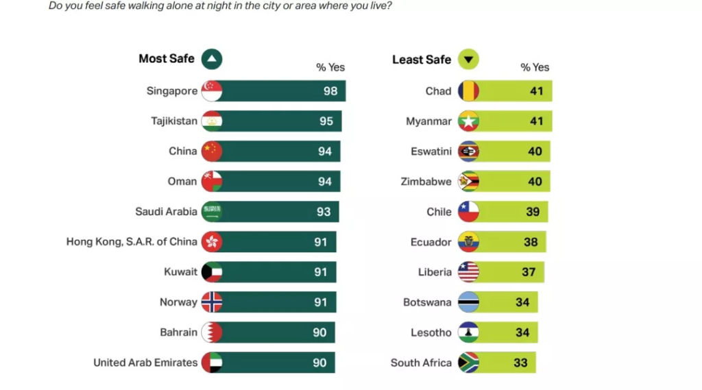 Celkovo 73 % dospelých na celom svete uviedlo, že sa cítia bezpečne, keď v noci chodia sami po meste alebo oblasti, kde žijú.